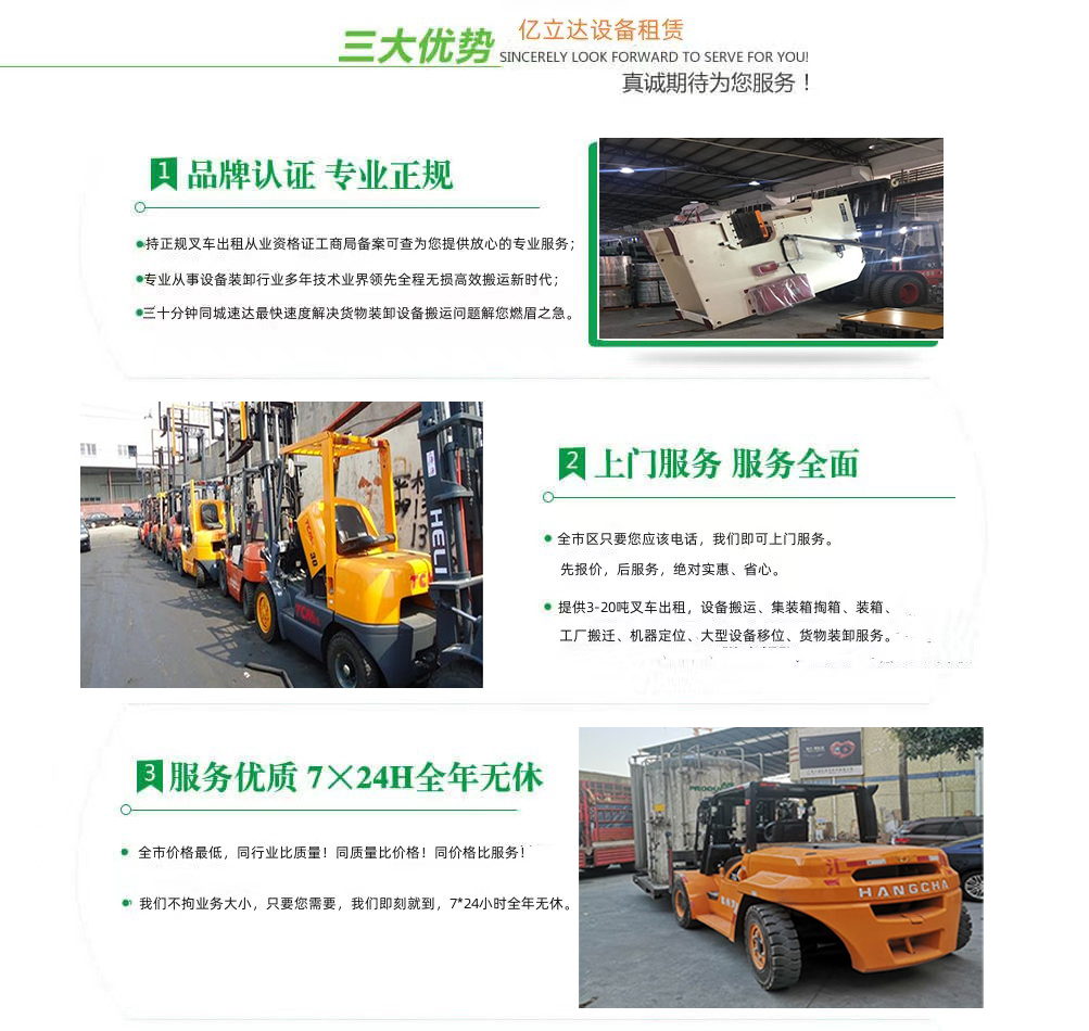 亿立达设备租赁有限公司是工商局准许的天津医科大学临床医学院专业叉车出租公司,公司本着诚信、服务、效率、创新的经营理念,用精湛的技术,真诚的服务,为众多客户提供优质的服务,同时获得信赖与支持。专业提供天津医科大学临床医学院3-20吨叉车出租、叉车租赁、设备搬运、集装箱掏箱装箱、机器移位定位、货物装卸、工厂搬迁、安全可靠,收费透明,价格便宜,随叫随到,24小时上门服务!本公司叉车吊车师傅对各种设备搬运装卸都有深刻探讨和研究。很多的疑难设备搬运,通过我公司的叉车师傅都能迎刃而解。对各种进口设备、国产机器、大型设备搬迁、高难度搬迁、各种精密仪器、医疗设备、科研设备等都能搬运; 提供全市 24 小时上门装卸搬运服务。同时提供厂房搬迁服务。 ...